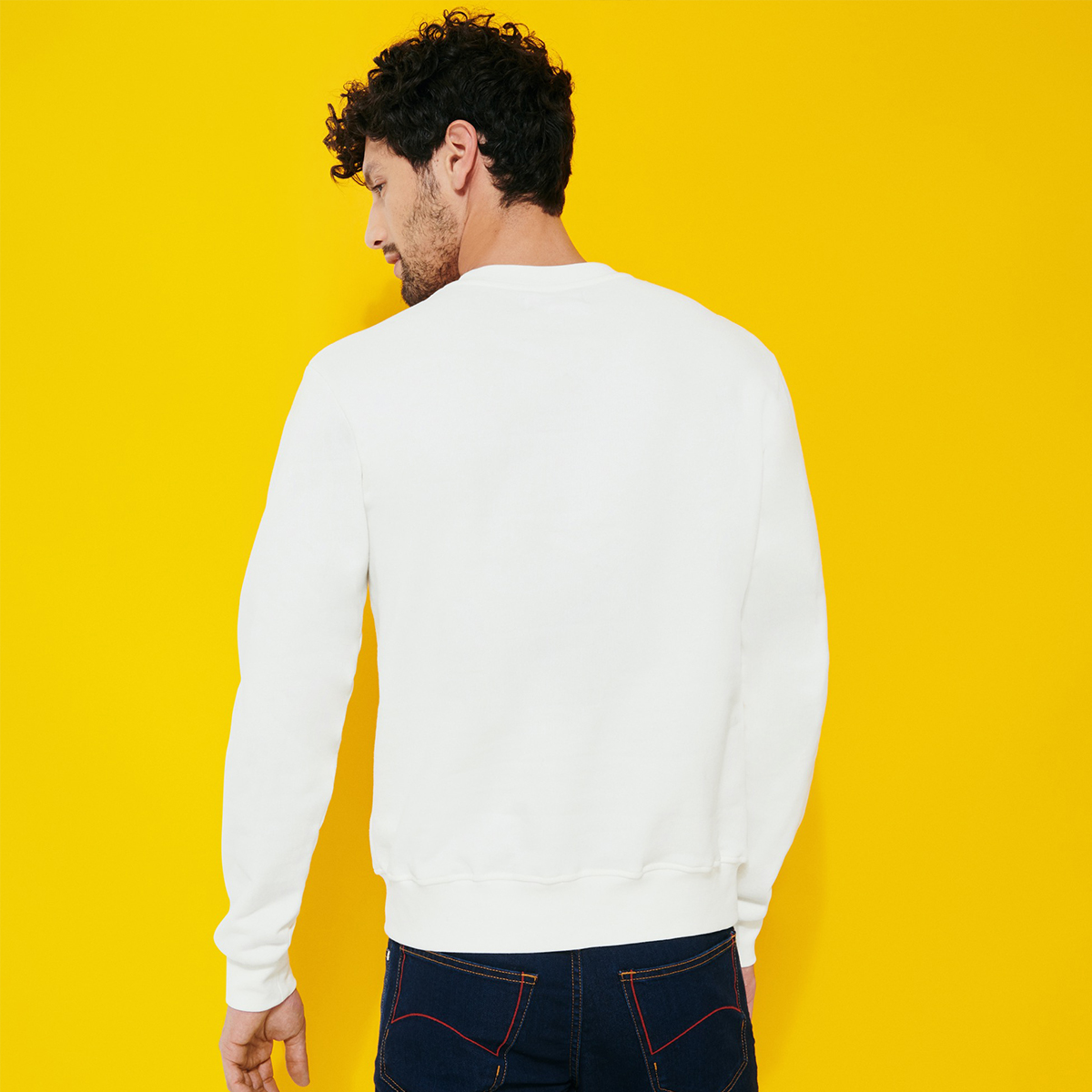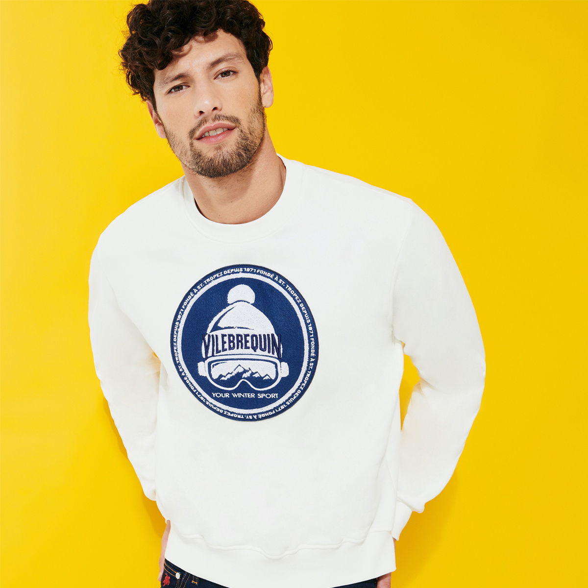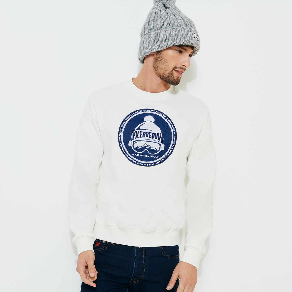 Vilebrequin, Bornand erkek kazağı ile kış moduna giriyor. Önünde Vilebrequin logo, bere ve kayak gözlüğünden oluşan desen detayı; altında, yaka ve manşetlerde ise aynı tonda nervür detayı yer alıyor.